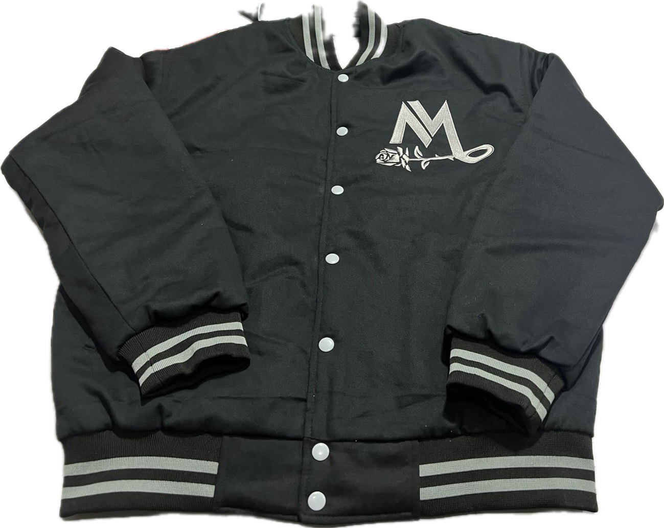 Elevate your style with this classic black varsity jacket. Featuring a minimalist embroidered "M" logo paired with a delicate rose design on the chest, it offers a unique blend of elegance and boldness. The jacket is crafted with durable fabric, while the ribbed cuffs, collar, and hem with grey stripe detailing provide a comfortable and sporty touch. Ideal for layering and versatile for any occasion.